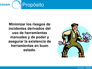 El documento proporciona información sobre el uso seguro y mantenimiento de herramientas manuales y de poder. Detalla las responsabilidades del gerente de proyecto, supervisores y trabajadores para comprar, entrenar en el uso y realizar inspecciones de las herramientas. También describe los diferentes tipos de herramientas, clasificaciones, riesgos asociados y causas comunes de accidentes para promover su uso seguro.
