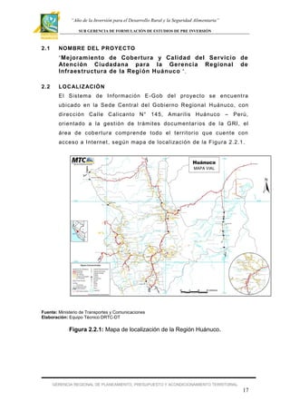 El documento describe un proyecto para mejorar la cobertura y calidad del servicio de atención ciudadana a través de una infraestructura de gobierno electrónico en la región de Huánuco, Perú. Se propone implementar un sistema de información E-Gob para gestionar trámites documentarios de manera en línea. La unidad formuladora es la Sub Gerencia de Formulación de Estudios de Pre Inversión de la Gerencia Regional de Planeamiento, Presupuesto y Acondicionamiento Territorial de Huánuco.
