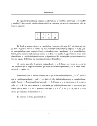 El documento explica el concepto de incrementos y cómo calcularlos para funciones. Introduce las variables Δx e Δy para representar los incrementos de las variables independiente x y dependiente y, respectivamente. Deriva una fórmula general para calcular Δy en términos de x, Δx y la función f(x). Proporciona ejemplos numéricos y de funciones para ilustrar cómo aplicar la fórmula. Finalmente, presenta 18 ejercicios para que el lector calcule Δx de diferentes funciones.