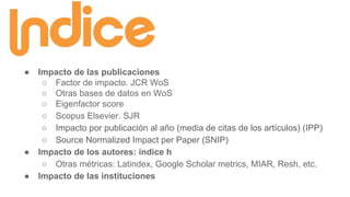 El documento aborda los indicadores bibliométricos utilizados para evaluar el impacto de la publicación científica, incluyendo el factor de impacto, índice h, y otras métricas como Eigenfactor y SJR. Se discute la importancia de estos indicadores en la evaluación de investigaciones y publicaciones, así como las limitaciones y variaciones según el campo disciplinario. También se mencionan herramientas y bases de datos que permiten acceder a estos indicadores y su utilidad para investigadores e instituciones.
