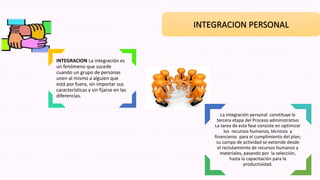 Este documento describe los conceptos clave de la integración de personal y la administración de recursos humanos. Explica que la integración personal es la tercera etapa del proceso administrativo y consiste en optimizar los recursos humanos, técnicos y financieros para cumplir con el plan. También describe los cuatro objetivos principales de la administración de recursos humanos: objetivos sociales, corporativos, funcionales y personales. Finalmente, resume las etapas clave del proceso de reclutamiento, selección e inducción de personal.