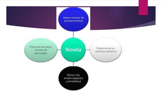 La novela se caracteriza por ser una obra extensa y compleja escrita en prosa que puede tener varios personajes y acciones. Aunque es producto de la imaginación del autor, guarda una estrecha relación con la realidad y presenta hechos creíbles para el lector. El documento también menciona diferentes géneros de novela y curiosidades sobre este tipo de obra literaria.