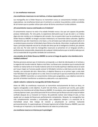Las enseñanzas rosacruces tienen un carácter práctico para aplicar en la vida cotidiana, no son meramente teóricas. Se basan más en la inteligencia del corazón que en el intelecto, y están expresadas de forma sencilla para que todos puedan comprenderlas. Los estudios rosacruces no apartan a los miembros de la realidad, sino que les permiten transformar su existencia de acuerdo a sus aspiraciones espirituales y materiales. Las monografías rosacruces son revisadas y actualizadas continuamente por un