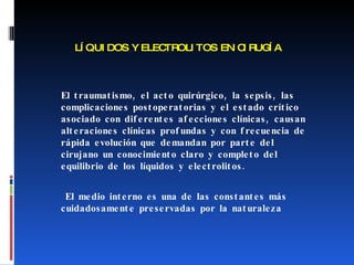 El documento trata sobre los líquidos y electrolitos en cirugía. Explica que el traumatismo, el acto quirúrgico y otras afecciones pueden causar alteraciones en el equilibrio de los líquidos y electrolitos del cuerpo. Describe los diferentes compartimientos de líquidos corporales, la composición y presión osmótica de los líquidos, y los mecanismos de regulación del volumen y osmolalidad a nivel renal e hipotalámico. También clasifica las alteraciones de los líquidos y electrolitos, y explica