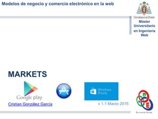 El documento analiza los modelos de negocio y comercio electrónico en plataformas móviles, destacando Google Play y App Store como principales mercados de aplicaciones. Describe características como la distribución de ingresos, requisitos para desarrolladores y estadísticas de descargas. Se enfatiza la diferencia en políticas de aceptación de aplicaciones y costos asociados a la publicación en ambas plataformas.