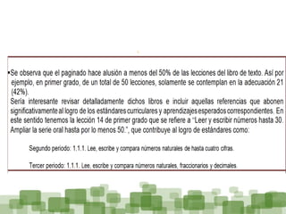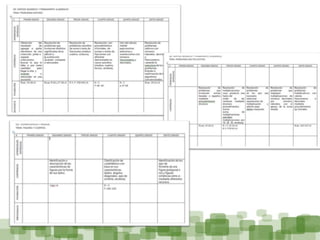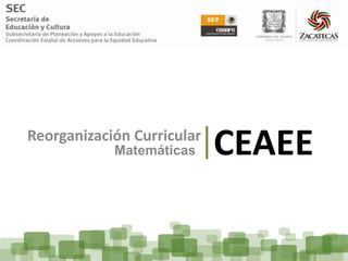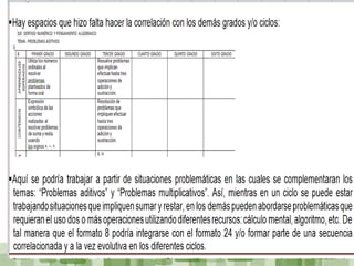 Este documento describe el proceso de reorganización curricular de matemáticas en cuatro momentos: 1) correlacionar contenidos de primero a sexto grado, 2) ajustar la paginación en libros de texto, 3) asignar aprendizajes esperados a contenidos, y 4) distribuir adecuaciones por bimestre. Luego, se revisó la progresión de contenidos, repeticiones y aprendizajes esperados. Finalmente, un equipo externo evaluó y se realizaron ajustes por ciclo.