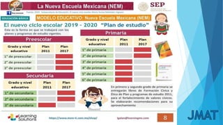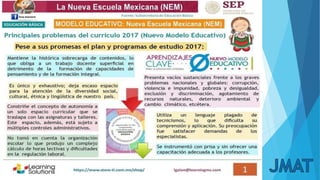 El documento describe la Nueva Escuela Mexicana (NEM), la nueva reforma educativa impulsada por el presidente López Obrador. La NEM tiene un plan de estudios balanceado y flexible que promueve valores como la perspectiva de género, las matemáticas, la lectura y más. Una parte clave de la NEM es el Programa Escolar de Mejora Continua, el cual se basa en un diagnóstico de las necesidades de los estudiantes y propone actividades como pausas activas.