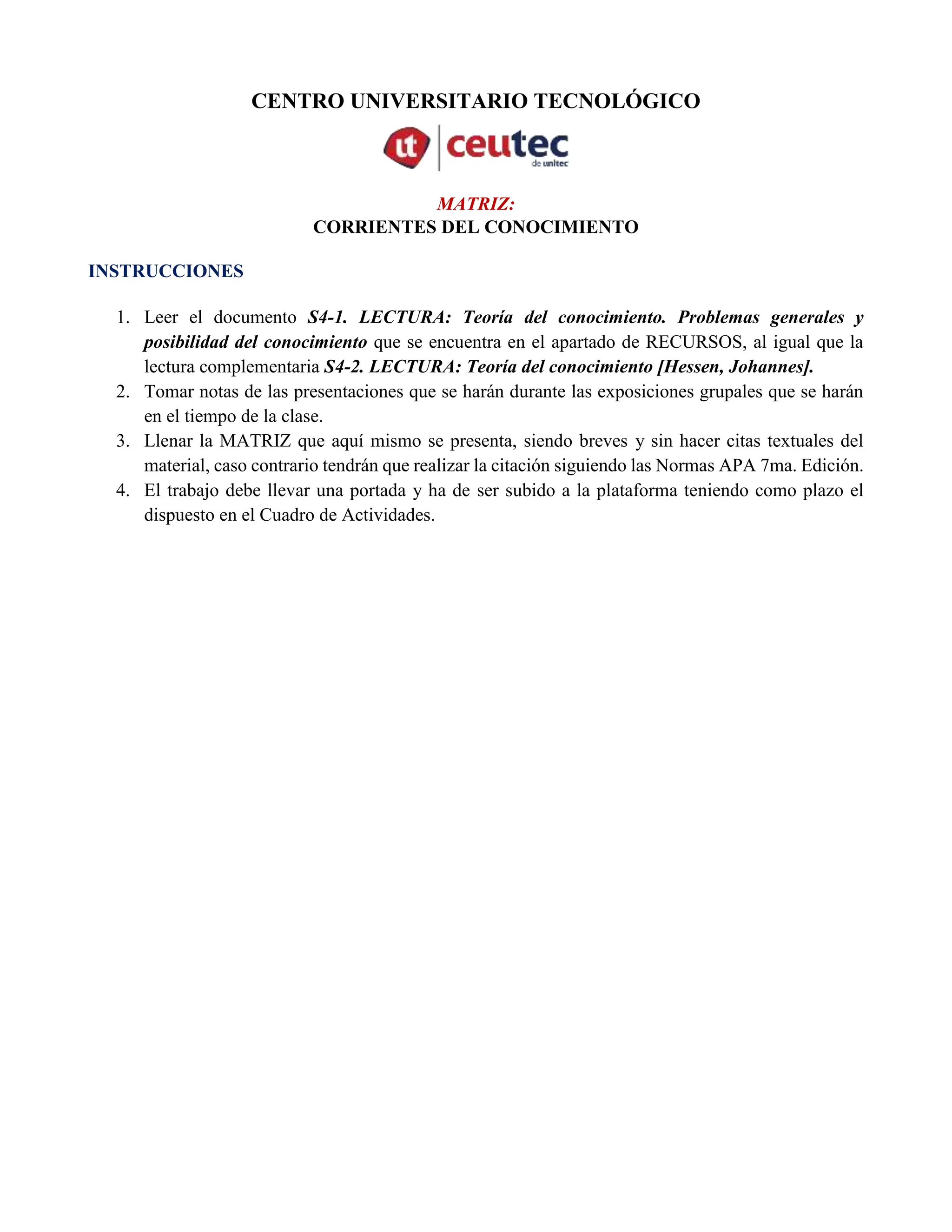 El documento proporciona instrucciones para estudiar teorías del conocimiento, abordando corrientes como el dogmatismo, escepticismo, subjetivismo, empirismo y racionalismo. Cada corriente plantea diferentes perspectivas sobre la posibilidad de conocer la verdad y los métodos para alcanzar el conocimiento. Se enfatiza la importancia de tomar notas durante exposiciones y seguir estándares de citación en un trabajo final.