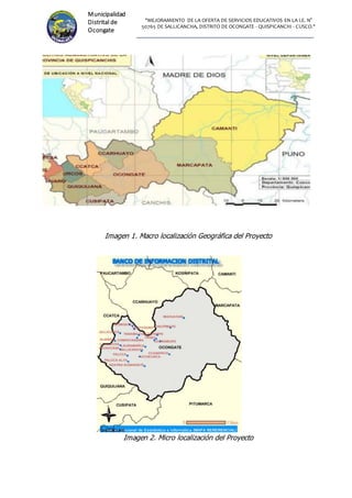 Este documento describe un proyecto para mejorar la oferta de servicios educativos en la Institución Educativa N° 50765 de Sallicancha en el distrito de Ocongate, provincia de Quispicanchi en Cusco. El proyecto consiste en la construcción de nuevas aulas, servicios higiénicos, biblioteca, sala de profesores, dirección, cocina y patio deportivo, con el objetivo de brindar una mejor infraestructura educativa y reducir el analfabetismo en la zona.