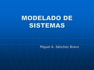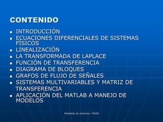 Este documento trata sobre el modelado de sistemas. Explica conceptos clave como ecuaciones diferenciales de sistemas físicos, linealización, transformada de Laplace, función de transferencia, diagramas de bloques y grafos de flujo de señales. También cubre sistemas multivariables y aplicaciones de MATLAB para el manejo de modelos.