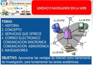 Internet surgió originalmente como un proyecto militar estadounidense pero luego se expandió a universidades y centros académicos. La red revolucionó las comunicaciones al permitir la transmisión de información entre computadoras de manera independiente de su ubicación geográfica. Internet es una red mundial de redes que permite comunicarse y buscar información sin costos tecnológicos ni económicos elevados. Ofrece servicios como la World Wide Web, correo electrónico, grupos de noticias y transferencia de archivos. Los navegadores web permit
