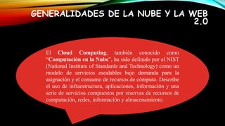 Este documento describe la nube, la web 2.0, las redes sociales y los tipos de almacenamiento en la nube. Explica que la nube ofrece recursos de computación escalables bajo demanda y que la web 2.0 facilita el trabajo colaborativo entre usuarios que pueden crear y compartir contenido. También define las redes sociales como estructuras que conectan personas y describen ventajas como una mayor comunicación pero también desventajas como la exposición de información personal. Finalmente, menciona que el almacenamiento en la nube perm