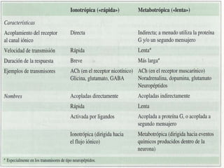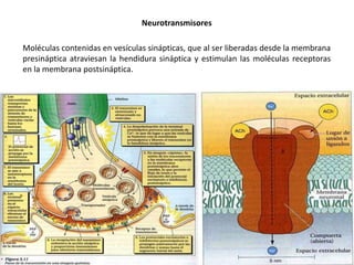 Los neurotransmisores son moléculas contenidas en vesículas sinápticas que se liberan de la neurona presináptica para estimular receptores en la neurona postsináptica. Pueden ser excitatorios o inhibitorios dependiendo del tipo de receptor. Se descubrió que la acetilcolina es el primer neurotransmisor y debe cumplir ciertos criterios como ser producido y liberado por la neurona presináptica para causar un efecto en la postsináptica. Los neurotransmisores se inactivan por difusión, degradación enzim