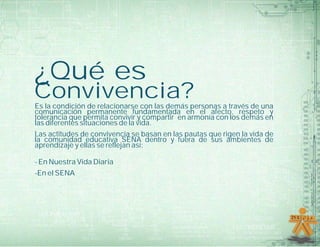 Este documento presenta las normas de convivencia para la comunidad educativa del SENA. Define la convivencia como la capacidad de relacionarse con los demás a través del respeto, afecto y tolerancia. Luego, detalla una serie de normas para garantizar la convivencia en la vida diaria, las instalaciones del SENA e incluyendo espacios específicos como baños, cafeterías, bibliotecas, transporte, áreas deportivas e internados. Finalmente, enfatiza que la responsabilidad de una buena convivencia depende del comportamiento individual
