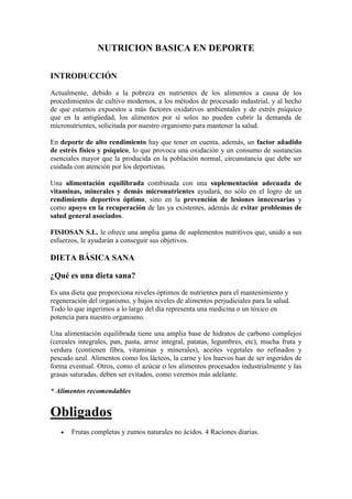 Este documento describe los principios básicos de una nutrición saludable para el deporte, incluyendo una dieta equilibrada con frutas, verduras, cereales integrales, legumbres, pescado, nueces y aceites vegetales, así como suplementos nutricionales. También explica los macronutrientes proteínas, hidratos de carbono y lípidos, y clasifica los alimentos en recomendables y perjudiciales.
