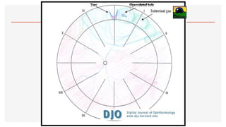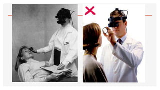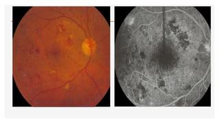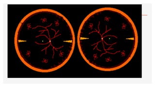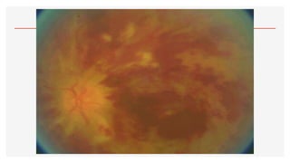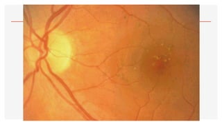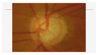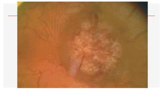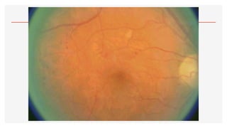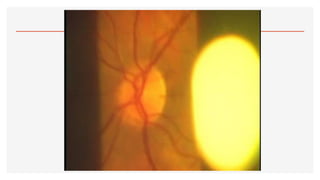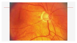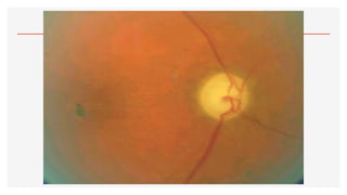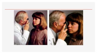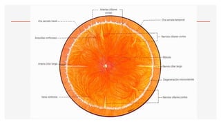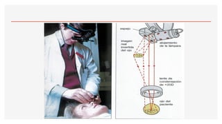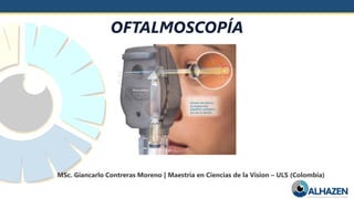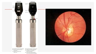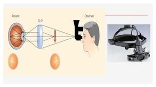 El documento aborda la oftalmoscopía, detallando sus tipos, como la directa e indirecta, y sus principios de funcionamiento. Se describen las características de cada tipo de oftalmoscopio, así como las lentes utilizadas y las evaluaciones necesarias para el examen del fondo de ojo. Además, se presentan diferentes condiciones patológicas observables durante el examen, proporcionando un esquema de localización de lesiones y criterios de diagnóstico.