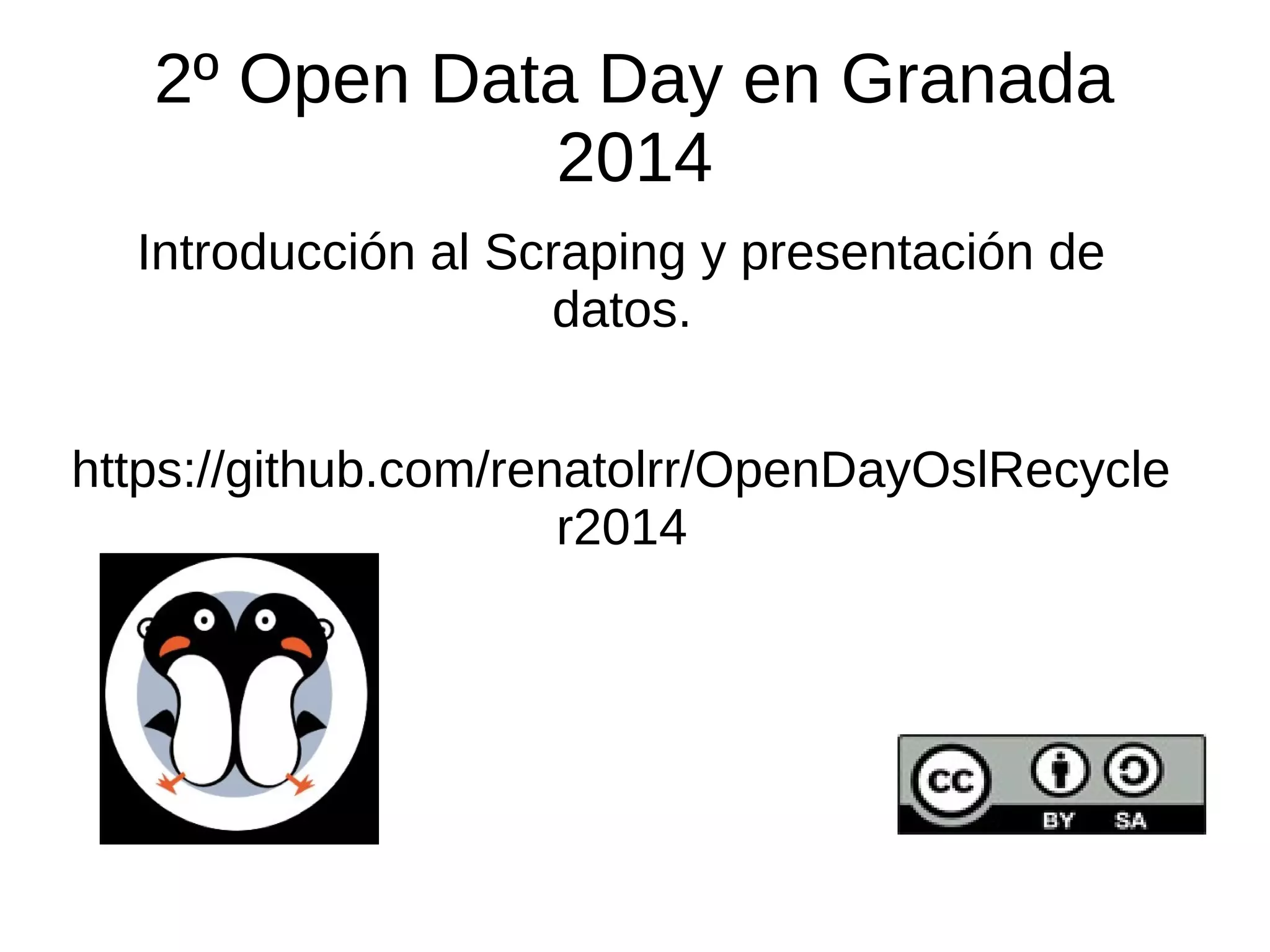 Este documento resume una presentación sobre scraping realizada en el 2o Open Data Day en Granada en 2014. Explica conceptos básicos de scraping como la definición, buenas prácticas como planificar y conservar fuentes, y aspectos legales. También revisa herramientas para scraping como Scrapy, HTTrack y alternativas. El objetivo final es recopilar y modificar datos de campañas de reciclaje para crear una tabla en Google Fusion.