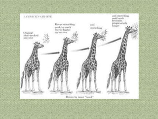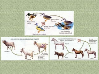 El documento describe las teorías sobre el origen de la vida y la evolución de las especies. Explica que la vida pudo haber surgido a partir de moléculas orgánicas simples que formaron estructuras capaces de autorreplicarse, y que las especies evolucionaron a través de mecanismos como la selección natural y las mutaciones genéticas, dando lugar a nuevas especies a lo largo del tiempo. También presenta evidencias de la evolución como las similitudes bioquímicas entre organismos, el registro fósil, y las similitudes