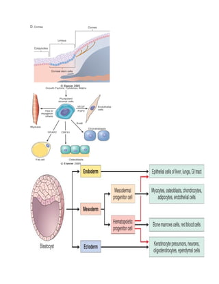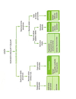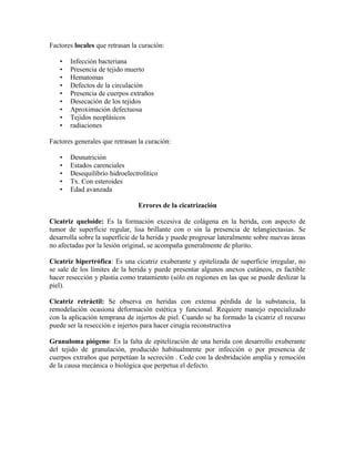 El documento describe los mecanismos de cicatrización de heridas, incluyendo las fases de sustrato, proliferativa y de remodelación, así como factores que afectan la cicatrización. También explica tipos de cicatrización como de primera, segunda e intención, y posibles defectos como dehiscencia, eventración y fístula. Además, detalla procesos como angiogénesis, regeneración y reparación celular mediante factores de crecimiento.