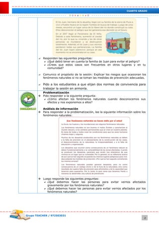 Este documento presenta la planificación de una sesión de aprendizaje para estudiantes de cuarto grado. La sesión tiene como objetivo explicar los riesgos que ocasionan los fenómenos naturales si no se toman medidas de prevención adecuadas. La sesión incluye una introducción, actividades de problematización, análisis de información y toma de decisiones. Finalmente, se incluyen criterios de evaluación y preguntas de reflexión para los estudiantes y maestros.