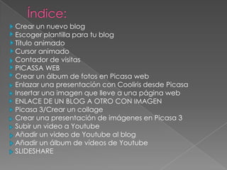 Este documento proporciona instrucciones para crear y personalizar un blog, incluyendo cómo agregar plantillas, títulos animados, contadores de visitas, álbumes de fotos de Picasa Web, presentaciones de Cooliris, enlaces a otras páginas mediante imágenes, collages y presentaciones de videos en Picasa 3, y agregar videos de YouTube al blog. Explica cómo usar servicios como SlideShare para compartir el blog con otros.