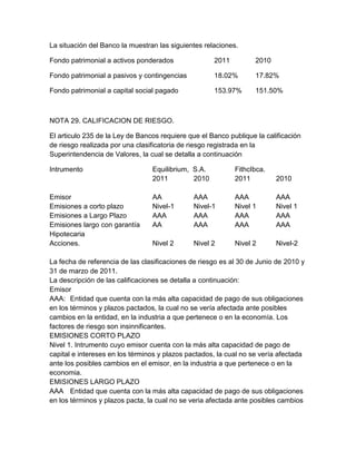 El documento contiene información sobre varios contratos celebrados por una entidad entre 2011 y 2013, incluyendo contratos de arrendamiento de inmuebles y prestación de servicios. También incluye notas sobre requerimientos de capital, calificaciones de riesgo de la entidad y segmentos de negocio.