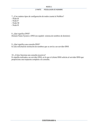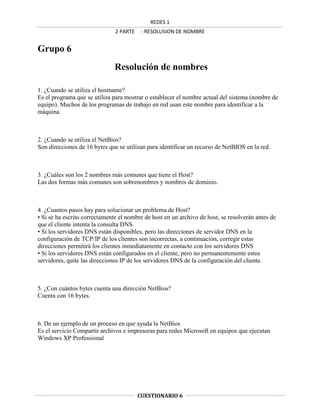 Este documento habla sobre la resolución de nombres en redes. Explica que el hostname se usa para mostrar o establecer el nombre de un sistema, y que programas de red lo usan para identificar máquinas. También explica que NetBios usa direcciones de 16 bytes para identificar recursos de red, y que los dos nombres más comunes de un host son sobrenombres y nombres de dominio. Además, detalla los pasos para resolver problemas de hostname y que NetBios usa nodos tipo B, P, M y H para su configuración.
