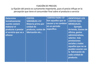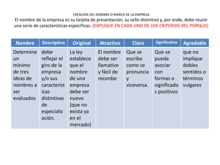 El documento describe los criterios clave para crear un nombre o marca de empresa efectiva. Debe ser descriptivo, original, atractivo, claro, significativo y agradable. También explica cómo determinar los costos fijos y variables para fijar precios, así como cómo calcular el punto de equilibrio.