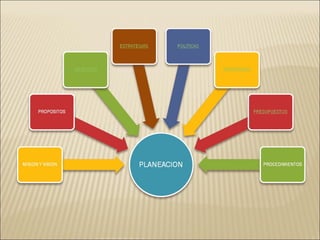 La planeación consiste en determinar objetivos y cursos de acción alternativos para lograrlos con base en investigación y un plan detallado del futuro. Implica establecer estrategias, analizar opciones y seleccionar la decisión más adecuada para alcanzar los objetivos teniendo en cuenta recursos y tiempos requeridos. La planeación busca anticipar situaciones futuras para prepararse y trazar actividades por realizar.