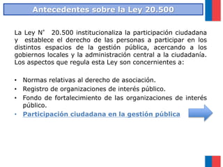 La ley N° 20.500 institucionaliza la participación ciudadana en la gestión pública y garantiza el derecho de las personas a involucrarse en políticas y decisiones gubernamentales. Los organismos del estado deben establecer modalidades de participación y asegurar la transparencia de la información, permitiendo a la ciudadanía opinar sobre políticas públicas. Además, se promueve la creación de consejos de la sociedad civil para favorecer la diversidad y representatividad en el proceso participativo.