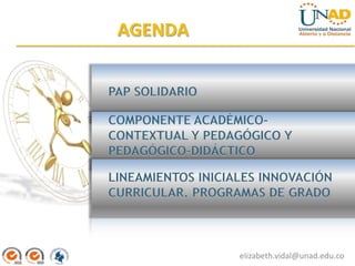 Este documento presenta los lineamientos iniciales para el rediseño curricular en la Universidad Nacional Abierta y a Distancia de Colombia (UNAD). Propone un enfoque centrado en el estudiante con énfasis en la investigación, la proyección social y el bienestar. Describe un sistema de gestión de la investigación a nivel nacional, zonal y local. Además, explica el rediseño curricular con énfasis en los macrocurrículos, mesocurrículos y microcurrículos operacionalizados a través del modelo pedagógico e-MPU de