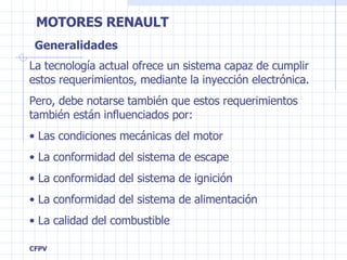 Los principales requisitos para un motor son potencia, torque y bajas emisiones contaminantes. Para lograr una combustión eficiente, se necesita una mezcla homogénea de aire y combustible gaseoso que sea encendida en el momento óptimo mediante el sistema de inyección electrónica. Las características del motor como el número de cilindros, cilindrada y relación de compresión afectan el desempeño, mientras que los sistemas de control de emisiones reducen la contaminación.