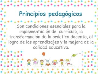 Los principios pedagógicos descritos en el documento incluyen: centrarse en los estudiantes y sus procesos de aprendizaje, planificar para potenciar el aprendizaje, y generar ambientes de aprendizaje que fomenten la colaboración para construir el conocimiento. También se enfatiza el desarrollo de competencias, logro de estándares curriculares y aprendizajes esperados, así como la evaluación para aprender y el uso de materiales educativos para fortalecer el aprendizaje.