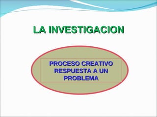 El documento describe los pasos del proceso de investigación científica, incluyendo la identificación de un problema, la formulación de objetivos y la justificación de la investigación. Explica que un problema científico surge de discrepancias entre lo real y lo ideal, y que los objetivos deben ser medibles y orientar las demás fases del proceso de investigación.