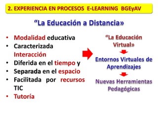 El documento habla sobre los fundamentos y experiencias en procesos de educación a distancia y e-learning en la BGE. Explica brevemente la historia y significado de la educación a distancia, sus fundamentos tecnológicos, culturales y pedagógicos. También describe la implementación de entornos virtuales, aulas virtuales y la metodología de blended learning usando plataformas como Moodle para proveer educación combinada presencial-virtual.