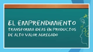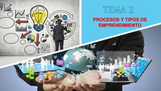 Este documento describe los procesos y tipos de emprendimiento. Explica las etapas del proceso emprendedor, incluida la generación de ideas de negocio, la evaluación de ideas, y la obtención de recursos como financiamiento e inversores. También destaca la importancia de formar un buen equipo de trabajo para el éxito del emprendimiento.