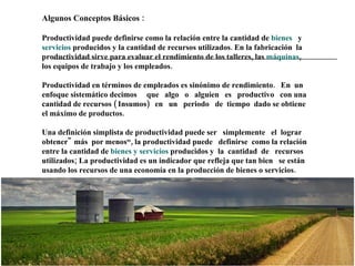 El documento define la productividad como la relación entre la cantidad de bienes y servicios producidos y la cantidad de recursos utilizados. Explica que medir la productividad de los empleados es sinónimo de medir su rendimiento. Además, señala que la única forma para que un negocio crezca y aumente sus utilidades es mediante el aumento de su productividad aplicando métodos de estudio de tiempos y sistemas de pago salarial.