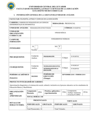 Este documento proporciona información sobre una unidad de análisis de programación estructurada en Java en la Facultad de Filosofía, Letras y Ciencias de la Educación de la Universidad Central del Ecuador. La unidad se llevará a cabo en el segundo semestre y cubrirá elementos básicos de programación en Java como control de flujo, arrays y Applets a través de métodos activos como aprendizaje basado en proyectos y problemas. Los estudiantes serán evaluados a través de trabajos individuales y grupales, exámenes y pro