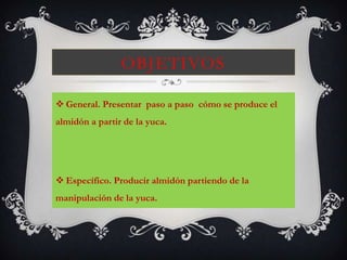 Este documento describe los pasos para producir almidón a partir de la manipulación artesanal de la yuca, con el objetivo general de presentar el proceso paso a paso y el objetivo específico de producir almidón. El propósito es enseñar a la población de El Salvador cómo producir almidón en casa para ahorrar dinero y participar en actividades familiares útiles. La evaluación se basará en si el proyecto logra producir almidón de manera sencilla y con participación familiar.
