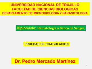 Este documento presenta información sobre varias pruebas de coagulación, incluyendo el tiempo de sangría, el método de Ivy y Duke, el tiempo de coagulación, la retracción del coágulo, el tiempo de protrombina, el tiempo de tromboplastina parcial activada y la determinación del fibrinógeno. Explica los procedimientos, valores normales e interpretación de los resultados de cada prueba.