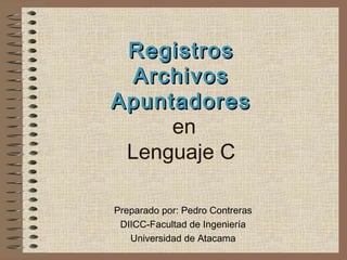 Este documento trata sobre registros, archivos y punteros en lenguaje C. Explica que los registros permiten definir nuevos tipos de datos compuestos, los archivos son utilizados para entrada y salida de datos, y los punteros almacenan direcciones de memoria y permiten acceder y modificar valores de variables.