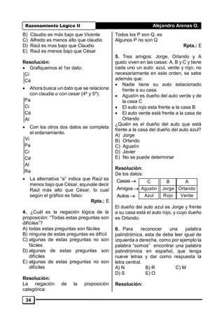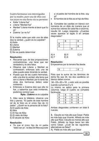 El documento presenta un problema lógico sobre cuatro hermanas (Katia, Liliana, Maribel y Zulema) que son interrogadas por su madre acerca del uso sin permiso de sus joyas en una fiesta. Cada hermana acusa a otra. La resolución determina que solo una de ellas dice la verdad, y que esa persona es Zulema, por lo que ella es la culpable. El documento también presenta otros 9 problemas lógicos similares con sus respectivas resoluciones.