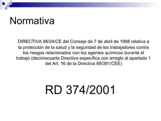 El documento resume la normativa española sobre la protección de los trabajadores frente a los riesgos derivados de la exposición a agentes químicos peligrosos. Establece que los empresarios deben evaluar dichos riesgos, adoptar medidas para eliminarlos o reducirlos, realizar vigilancia de la salud de los trabajadores si es necesario, informarles y formarles adecuadamente, y consultar a los representantes de los trabajadores.