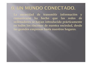 Este documento describe las redes informáticas y cómo se han introducido en todos los ámbitos de la sociedad. Explica que Internet es una red mundial que permite a los ordenadores comunicarse y compartir información. Además, la mayoría de usuarios tienen una red local aunque no siempre son conscientes de ello. Las redes proporcionan servicios variados como acceso a Internet, intercambio de información y conexión entre equipos.
