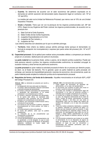 La relación jurídica procesal se produce cuando una de las partes de una relación jurídica sustantiva decide acudir a un órgano jurisdiccional para resolver un conflicto de intereses. Para que la relación jurídica procesal sea válida, deben cumplirse las condiciones de la acción como el interés, la legitimidad y la voluntad de la ley, así como los presupuestos procesales como la competencia del juez, la capacidad procesal de las partes y los requisitos formales y de fondo de la