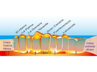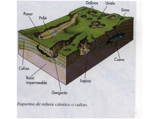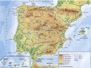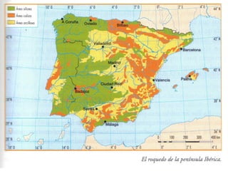 Este documento describe las características geológicas y geomorfológicas de la península ibérica. Explica que la península está compuesta por zonas de rocas antiguas como el granito, así como zonas de rocas sedimentarias más jóvenes como las calizas. También describe las cuatro principales unidades morfoestructurales - los zócalos, macizos antiguos, cordilleras de plegamiento y cuencas sedimentarias - y cómo se formaron a lo largo de la evolución geológica de la