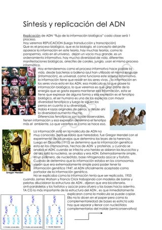 El documento describe el proceso de replicación del ADN. Explica que la replicación del ADN permite la transmisión de la información biológica entre generaciones a través de la copia semiconservativa de la doble hélice de ADN. Detalla los pasos del proceso, incluyendo la apertura de la doble hélice por helicasas, la síntesis de nuevas hebras complementarias por ADN polimerasas, y la ligación de los fragmentos por ligasas.