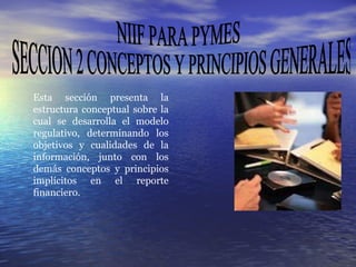 Este documento presenta los conceptos y principios generales de las Normas Internacionales de Información Financiera para Pequeñas y Medianas Entidades (NIIF para PYMES). Explica que los estados financieros deben proveer información útil para la toma de decisiones económicas de manera confiable. También describe características cualitativas como relevancia, materialidad, fiabilidad y equilibrio entre costo y beneficio. Define los componentes clave de los estados financieros, incluyendo activos, pasivos y patrimonio.