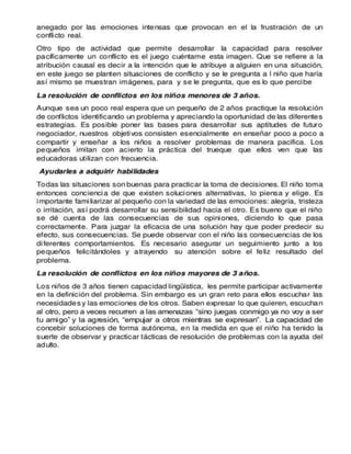 El documento describe varias técnicas para favorecer el desarrollo del autocontrol en los niños. Explica que los niños pequeños necesitan moverse y explorar activamente, y que este comportamiento es signo de vitalidad aunque a veces les cueste contener su entusiasmo. También habla sobre la importancia de desarrollar habilidades sociales como escuchar, compartir y expresar emociones. Finalmente, recomienda que los padres ayuden a sus hijos a practicar estas habilidades a través de ejemplos concretos en la vida cot