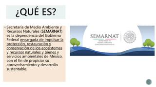La Secretaría de Medio Ambiente y Recursos Naturales de México (SEMARNAT) es la dependencia gubernamental responsable de promover la protección, restauración y conservación de los ecosistemas y recursos naturales del país. SEMARNAT trabaja en cuatro áreas prioritarias: la conservación y uso sostenible de ecosistemas y biodiversidad, la prevención y control de la contaminación, la gestión integral de recursos hídricos, y el combate al cambio climático.